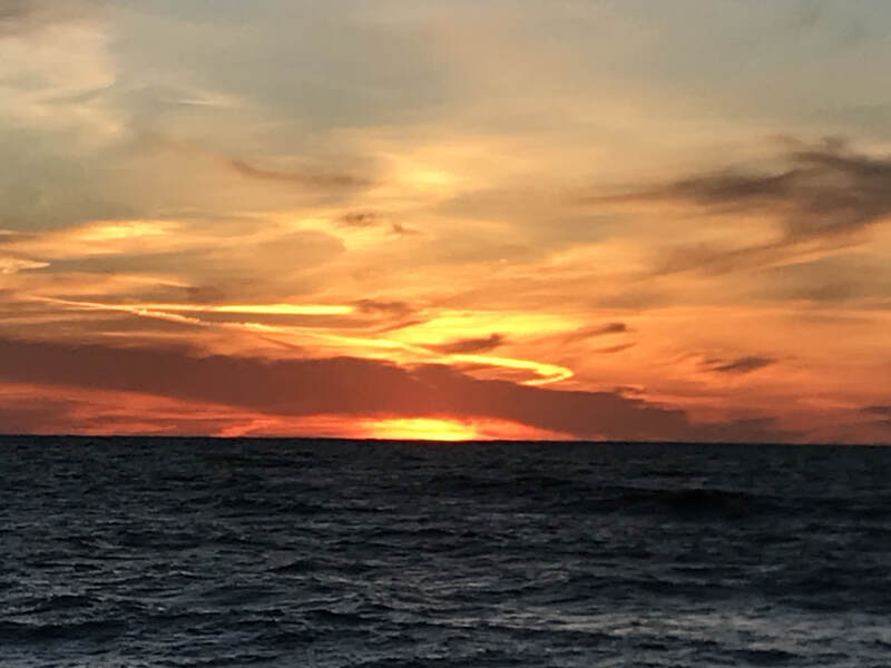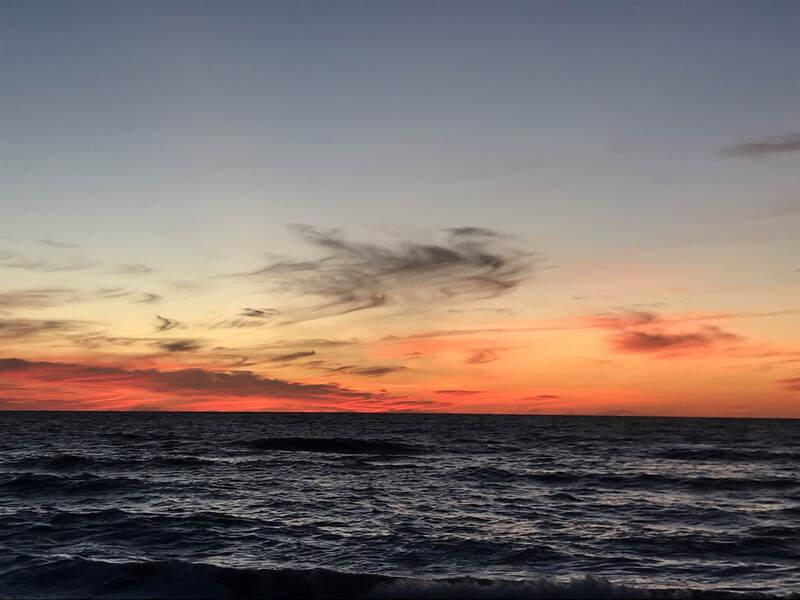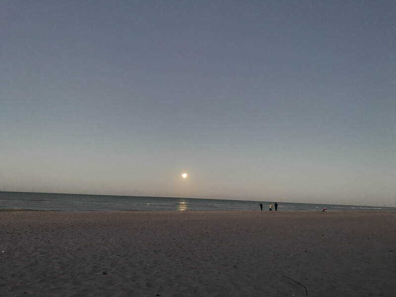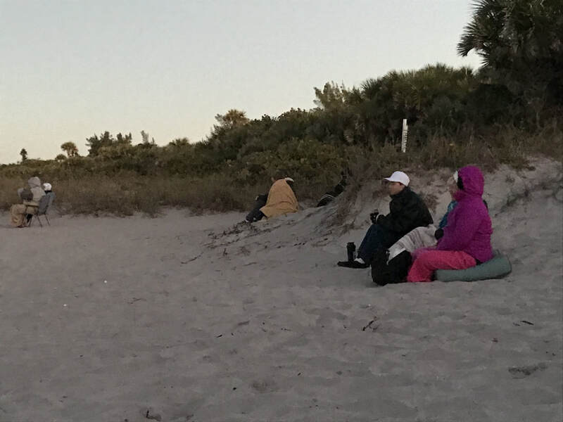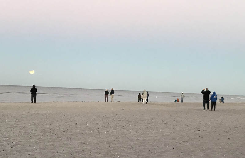 I returned to the beach for the eclipse. What was exciting was that the parking lot was surprisingly full--many others had the same instinct (we were all drawn, almost magnetically, to the unobstructed view over the Gulf). When I arrived it was still dark enough for the full moon to reflect in the water, although the sun was rising and that soon faded. The eclipse began and the excitement was palpable; all those bundled-up people (it was less than 50 degrees) facing westward, migrating closer and closer to the water as if they could be closer to the moon. Unfortunately, in this time zone the moon set before the moon was even fully covered or the eclipse was complete, so we never got to see the whole thing or the blood red effect. But this was quite a birthday gift!