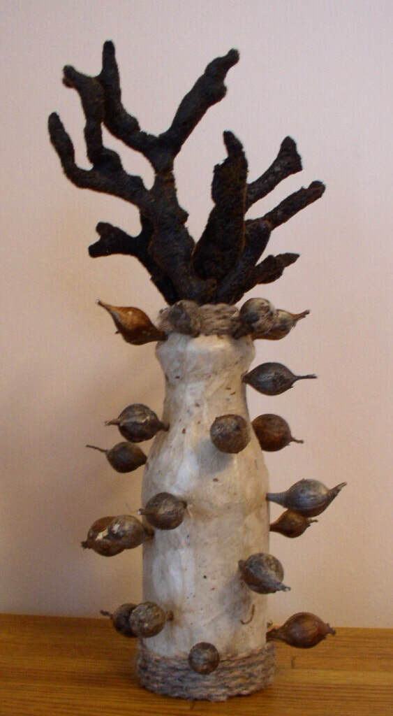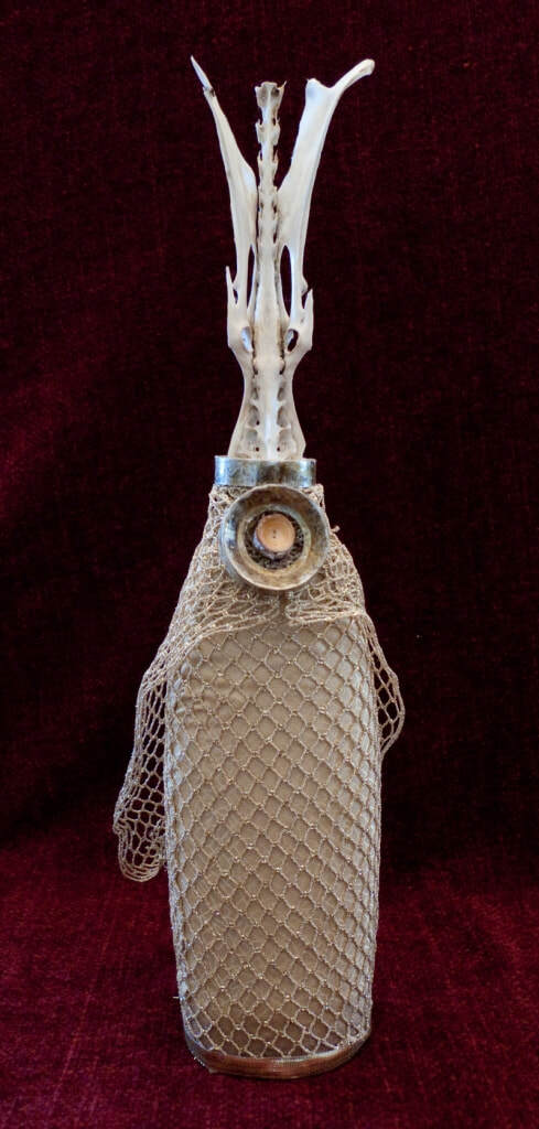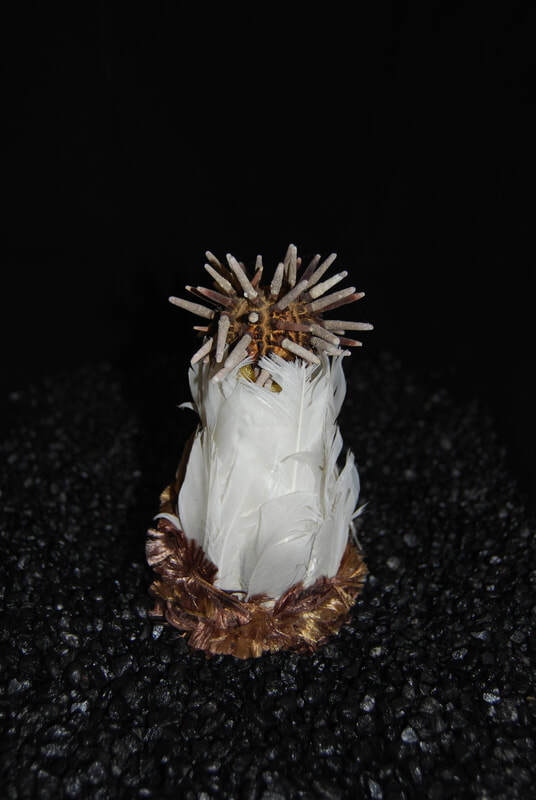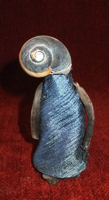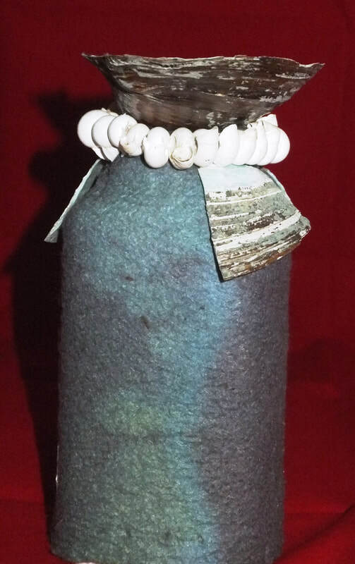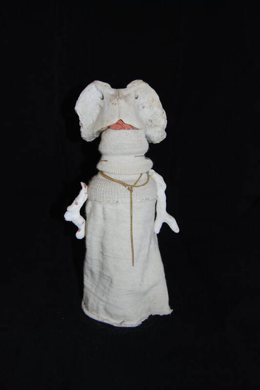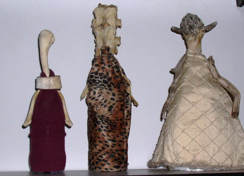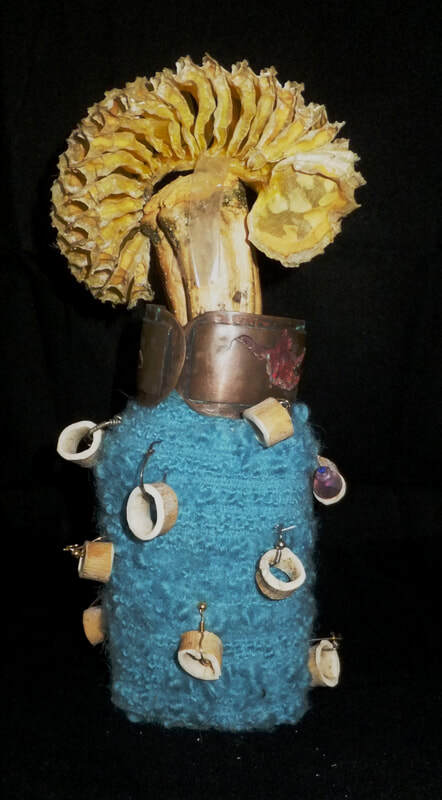 Fast forward a long time, to about the turn of the 21st century. One day as I was dancing around in my attic, where I had baskets holding some of the very materials I collected in the 1970s--shells, leather pouches, driftwood--I literally felt something re-awaken. I've referred to this as my "muse" waking up. I saw those materials that had stayed with me for decades and began to imagine them coming together as beings once again. I had new ideas about how to construct the figures, and I knew their new forms demanded a new name. I settled on (Las) Tierras, which I translate as Earth Beings. Many of the people who see them refer to them as dolls, but I don't relate to them that way. To me they are indeed still spirit figures, intermediaries, not mini-humans. They each have their own character, often emanating from their materials, but they embody energies from another realm. This does not make them unapproachable; like dolls, they are relatable. They are compelling, but not all equally serious--some are funnier than others. Some are forceful, some shy, some mysterious. Some can be disturbing, mostly because their materials remind people of decay and death.