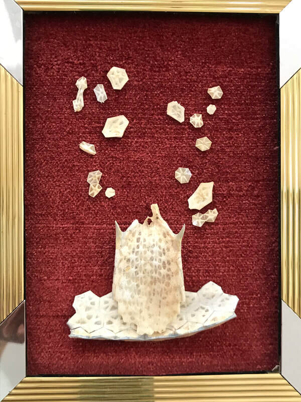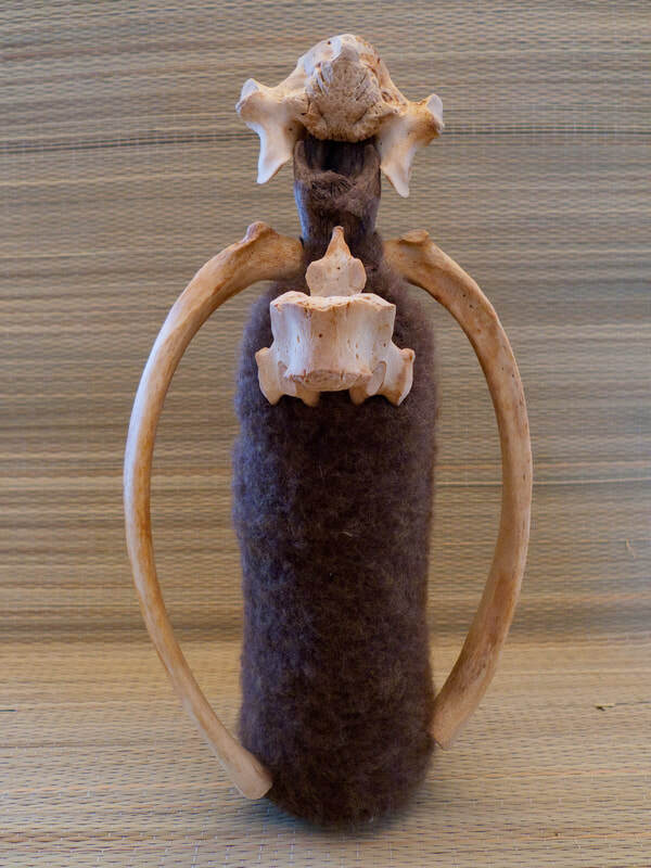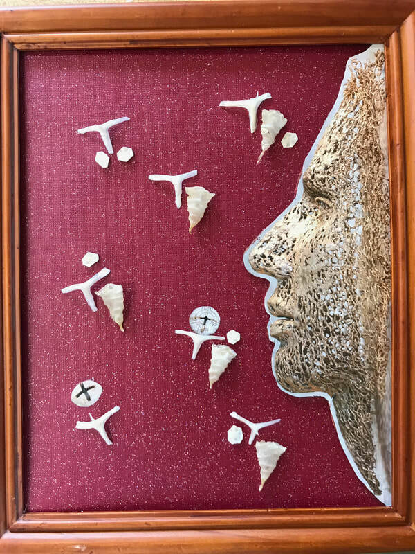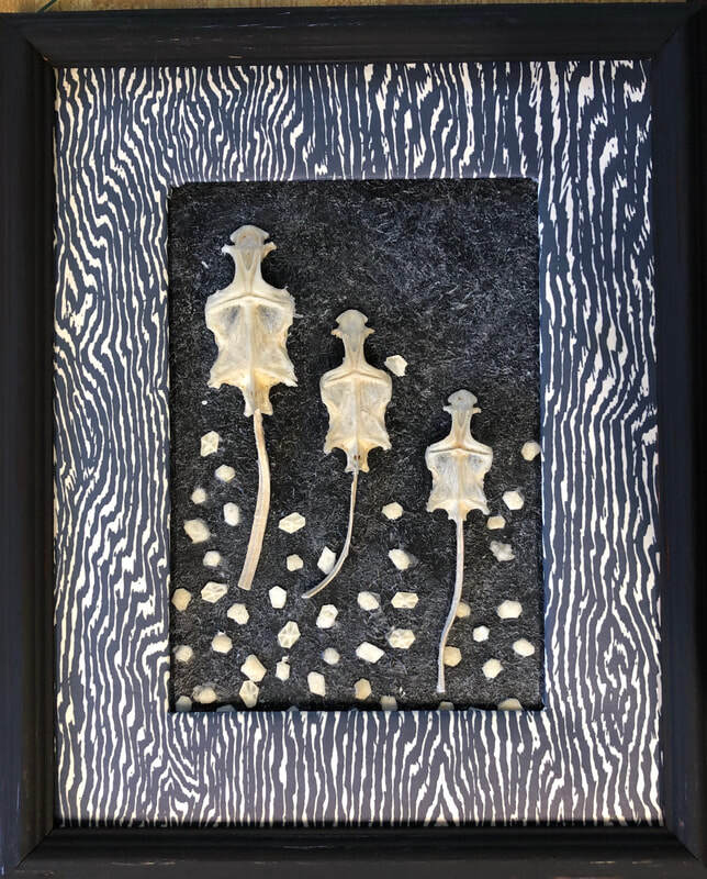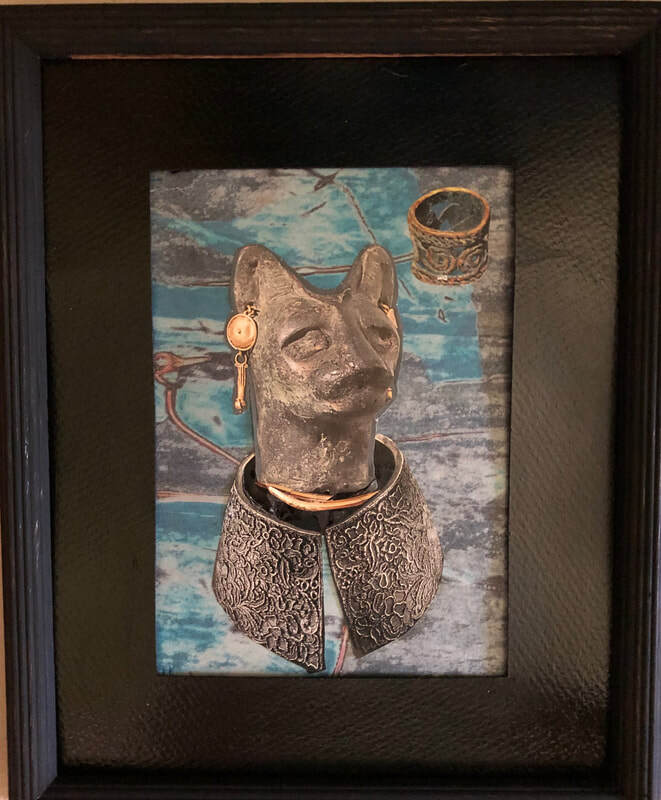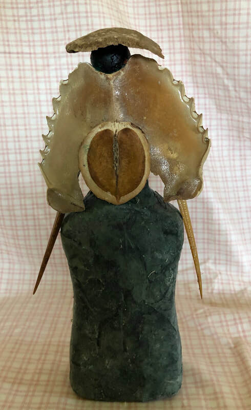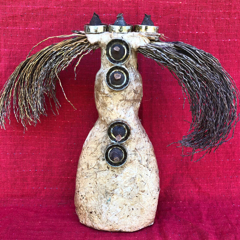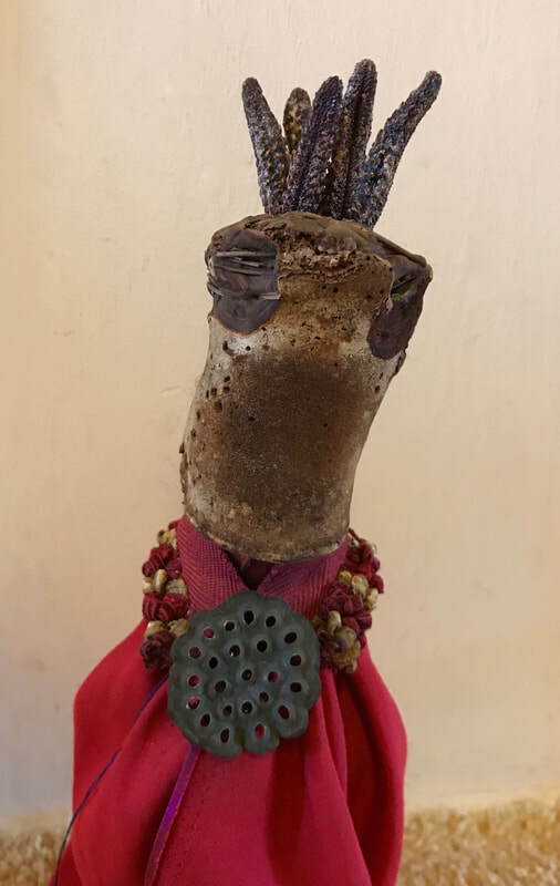 As regular readers may know, my art process is intuitive and usually without a preconceived idea about what will emerge. I do not set about to make representations of particular things or ideas; rather, I start with materials (e.g. bones, bark or other detritus; intriguing papers or fabric; or compelling pre-printed images), and see what "wants" to go with what (to be combined into something new)--what wants to emerge. I typically have a general form in mind--I would know I am working on a figural sculpture, for example, or a mask, or a piece that is part of a series relating to boats and crossings--vessels that take us from one place to another. Any given piece reveals itself in the process, however, and I m always having to I discover what feels right and where and how it should go.