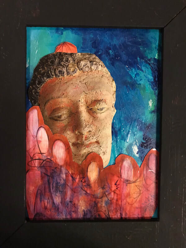 Since the process is fluid, I am often unsure what the piece may be "about" until it is finished. I have learned from the SoulCollage(R) process to let it speak to me --I ask it to tell me about itself, in its own voice. (In SoulCollage, we ask the finished collage to speak in the first person, to tell it who and what it is and what it wants us to know.) In the last five years or so I have begun to use this kind of inquiry with almost everything I make. It's a form of channeling.