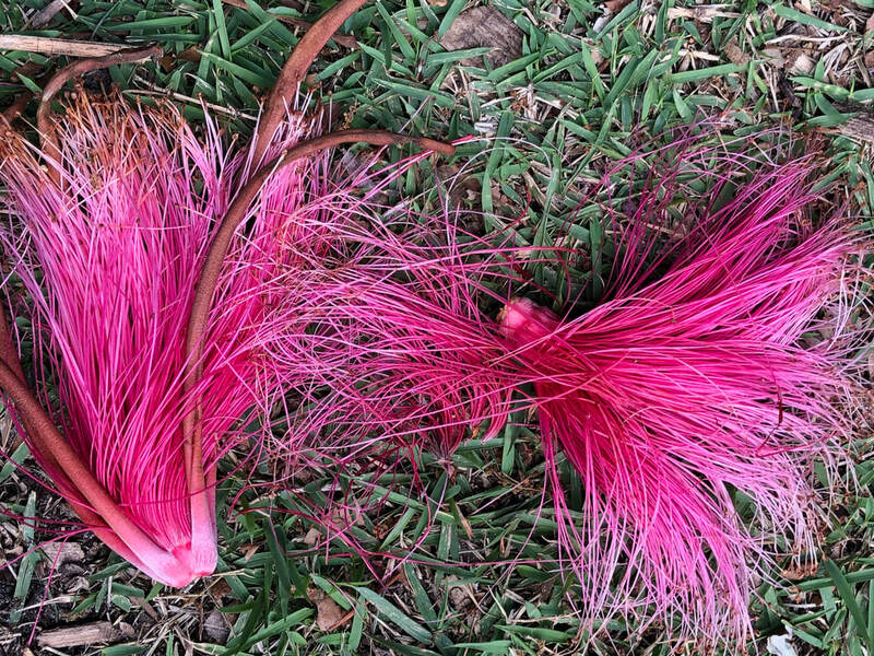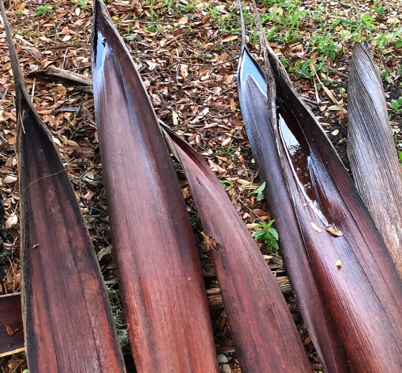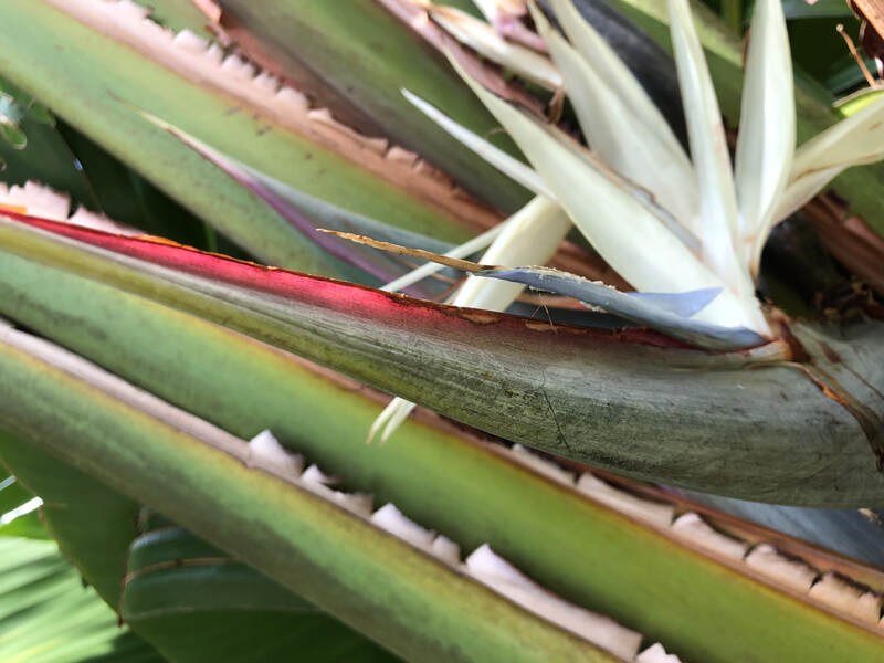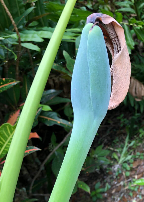 Birds sing out raucously at dawn and settle down later as the day moves on, but I see now how this is so for the plants as well; an alertness, loud presence, which will soften into absorption or even forbearance as the heat rises. Looking too at an anole—a small lizard—perched on the woody stem of the ti plant, its red-throated mating movement (it's a dewlap that protrudes in and out) announcing territory and readiness. Silent, to me, but speaking its own language at full volume. These are brown anoles that come in many color variations, and can apparently change their color to some degree. They are often spotted. They rush up tree trunks quickly, like squirrels, and as squirrels leap across branches, these little ones leap from leaf to leaf. They are part of the everyday scenery here, and the everyday drama. I found two locked together in my outdoor shower, so poignant, and yesterday I opened the mailbox to find not letters, but an anole with a truncated tail, resting. I’ve watched an egret grab one and run on its long legs, lizard tail dangling from its mouth. (Anoles can separate from their tails as a form of protection, and it's a strange sensation to pick one up that way and almost instantaneously be left with a disconnected tail in one's fingers.) I see one climbing the screen, legs akimbo, underbelly open to view.