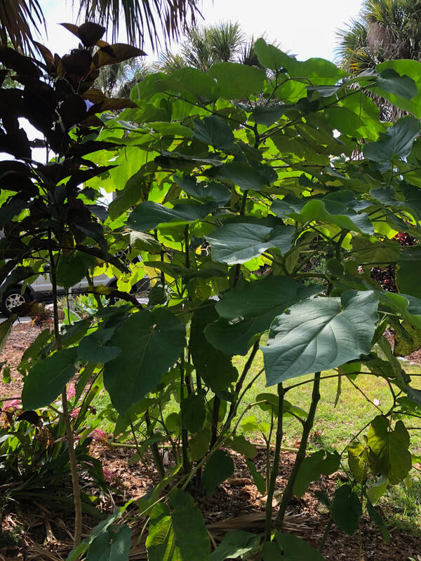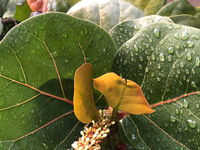 So much more: the legions of spiders, especially visible on the horizontal webs they spin among the spikes of the snake plants—sometimes even in vertical layers, creating a kind of apartment building—or smaller ones on the dewy morning grass. So much feeding going on, a reminder of how much insect life there actually must be here, largely unseen. Or in my studio, a separate building out back that seems to have its own ecology, the tiny creatures—pinprick small—that speed over surfaces astonishingly fast, like the whirling legs of the plovers and sandpipers on the sand that pump faster than our eyes can track. Glad to share the environment with all of them, though admittedly I’ve been furious at the rabbits that have chewed my baby plants down to the ground, leaving little moringa trees nothing but stems, or stripping the tart leaves off the cranberry hibiscus, even the new ones planted as replacements for what had been ravaged. Chasing the rabbits off is pointless, and I've tried sprays and spikes to little effect. I’ve found myself rooting for a predator (maybe one of those owls I hear calling in the night?), although it’s clear I have to make friends and find ways to share. (But bunny, there’s so much else to eat besides my nurselings….) The rabbits don’t seem to come out in the early morning, though perhaps I just don’t see.