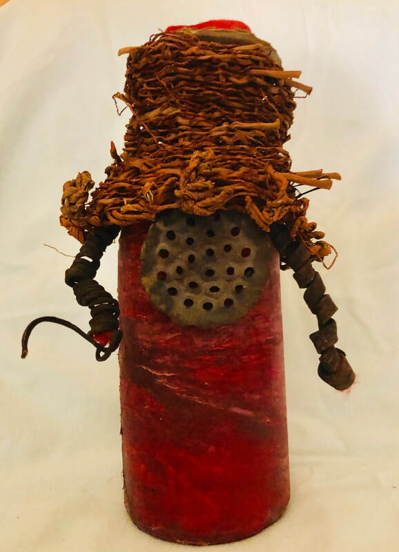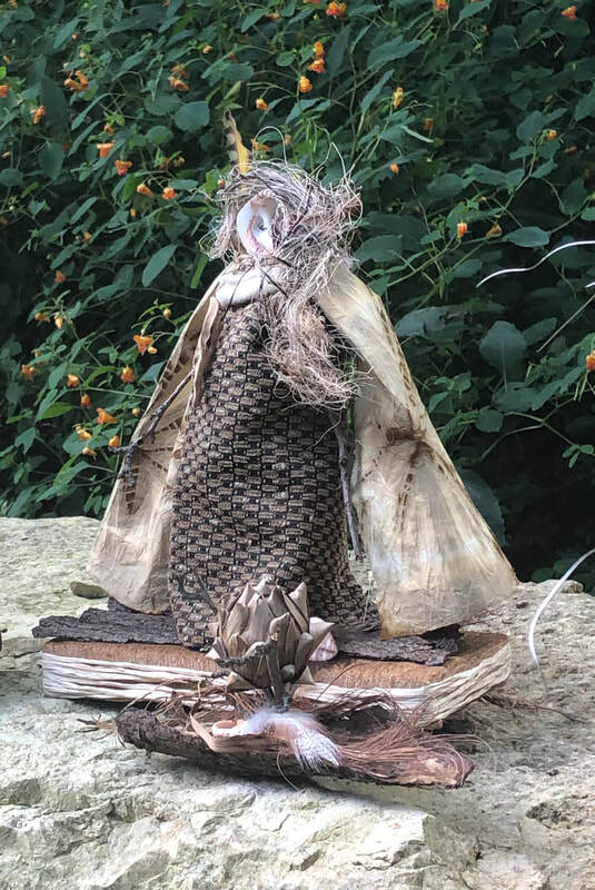 This piece brings together different aspects of my connection with the natural world. The prayer sticks that send their songs (gratitudes) up to the spirit realm are made from cup plant stems, collected in previous seasons from nearby prairies. Their hollow stems are square and woody, and have long caught my imagination. They are wrapped in sheep’s wool that I spun into (rather uneven) yarn over 40 years ago, and dyed with natural materials such as bloodroot, goldenrod, calendula, parsley, thyme, iron, and fermented indigo. It is a pleasure to let these old dyeing experiments come see the light of day, and in such a praise-worthy setting. I peeled the bark that contains the sticks from a just-cut tree, and as it dried, it curled itself into a heart shape. The purple stones are Baraboo quartzite, gathered one by one and treasured as reminders of our beautiful nearby hills.