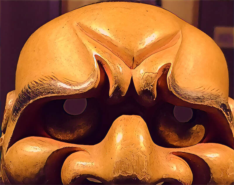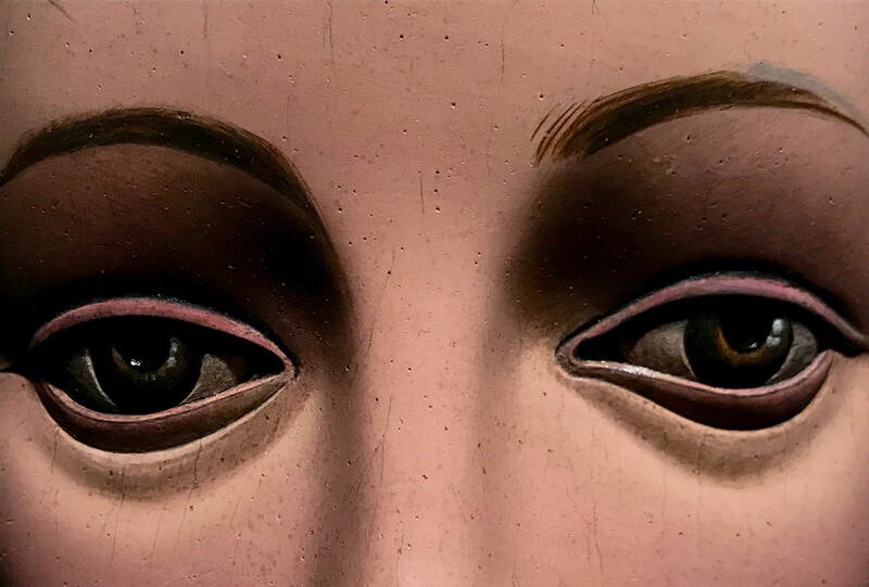 I came to realize that perhaps the most distancing (and sometimes disturbing) aspect of masks is those empty eyes--it's more than the fact that a particular identity is hidden. The blankness is fundamentally disturbing, even though we may be able to feel the character or emotion inscribed by a good mask maker, and even though the blank eyes allow us to project something archetypal.