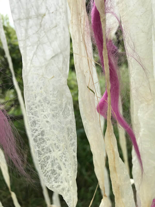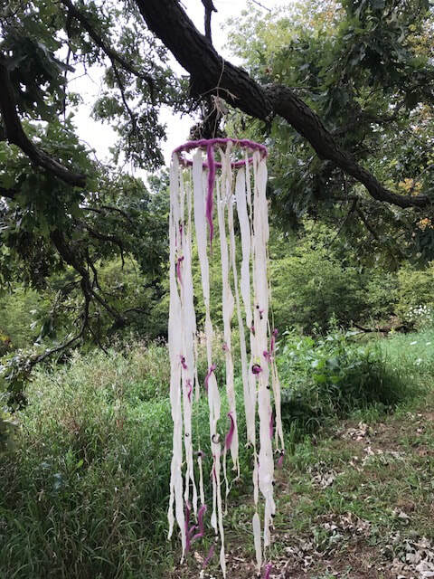 Since it's still a work in progress, I can't share anything yet about the piece I will contribute this year, but here are some images from "Hanging In," the one I created for the last Farley event in 2017. It was made with hog gut, mohair, raffia, mica rings, glass rings, and wooden twigs.
